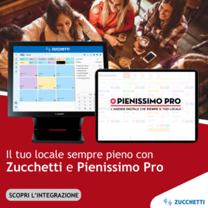 Pienissimo Pro si integra con i software gestionali. L'integrazione consente la sincronizzazione in tempo reale di pianta dei tavoli, menù, prenotazioni e promozioni. Il punto cassa invia a Pienissimo Pro la pianta e il menù, riceve le prenotazioni con tavolo assegnato e si aggiorna automaticamente in caso di modifiche. Le promozioni e i coupon sono gestibili direttamente dal punto cassa, per un flusso operativo semplice ed efficiente.